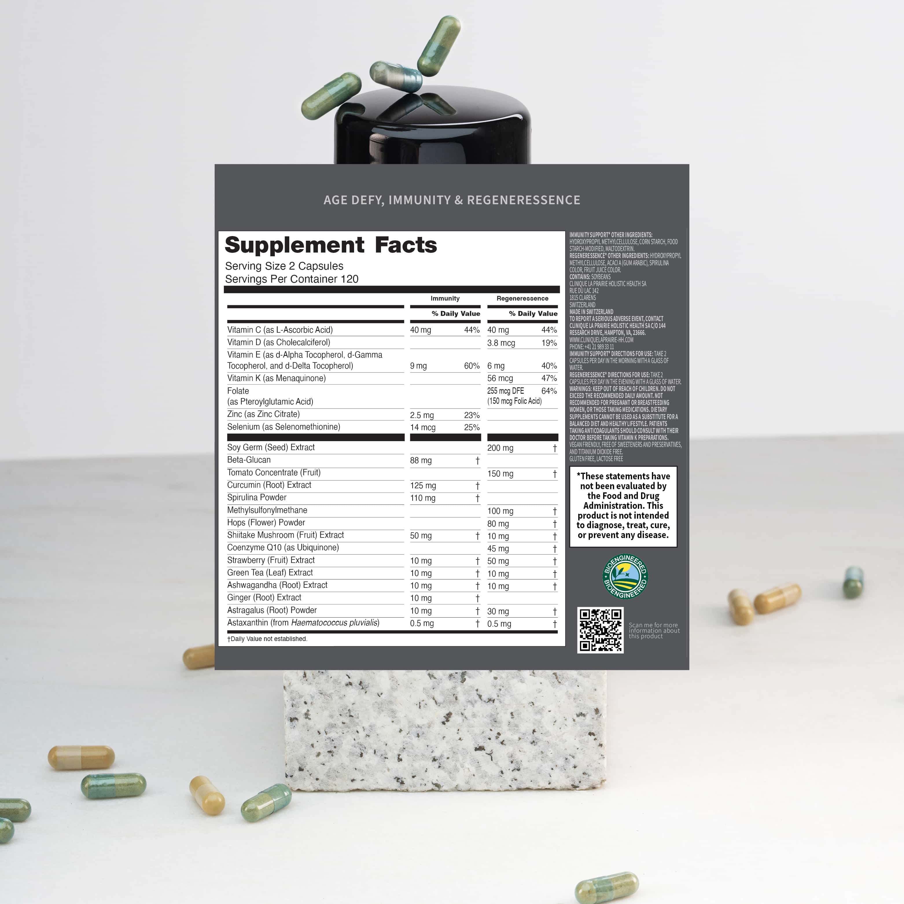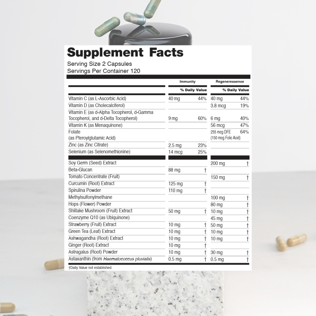 BetaVia™, Cavacurmin®, Astragalus, Spirulina, paired with 5 key vitamins, actives and nutrients ingredients.