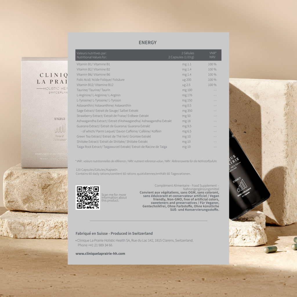 The formula combines the Holistic CLP Complex, Cognivia™, L-Tyrosine, and Taiga Root Extract with 8 other ingredients including stimulating plant extracts, amino acids, and vitamins.